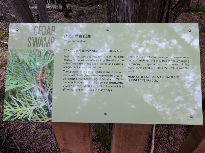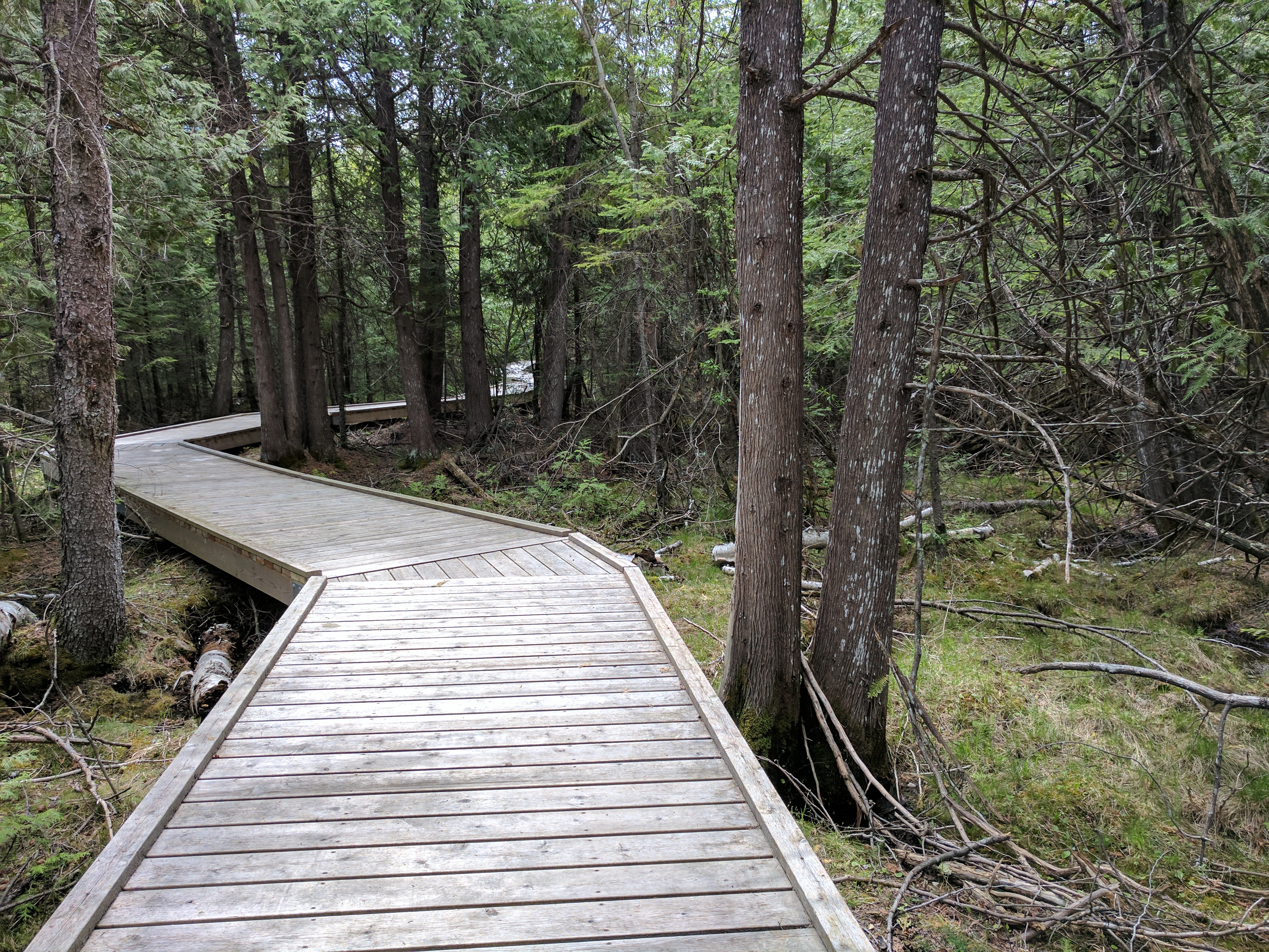 My daughter and I walked on the 1.5 km (one way) cedar boardwalk that winds through balsam fir forest, white cedar bog, and a rare type of peatland known as calcareous fern. I copied this description from the website. Other than being incredibly peaceful, I don’t know a whole lot about different types of forests. There is a good amount of signage along the way explaining about the different species of plant life and I really enjoyed reading some of the information.