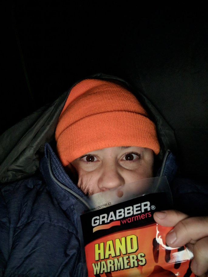 My sleeping bag is rated to 0°C. It went down to around – 5°C between 1 – 5 AM. I put hand warmers in each of my socks and moved two around on my upper body every two hours when I woke up to turn on my other side. I was comfortably warm except for my top arm.