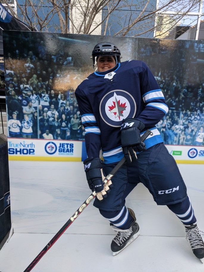 Last night I went to the Winnipeg Jets Whiteout party downtown. I am sort of a hockey fan but not really. I get excited when other people are excited and I like to take part in festivals and street parties around our city. I care if the Jets win, but not really. I spent $22 on a t-shirt to “blend in” with the crowd. It was the first time that I can recall that I have ever bought anything hockey related for clothes.