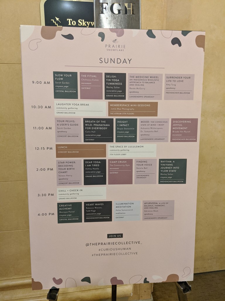 This was an energetic vinyasa yoga practice to the sounds of A Tribe Called Red, a Canadian electronic music group that blends elements of First Nations music with vocal chanting and drumming. Portions of the Medicine Wheel and what the sides represent were incorporated into the practice. It was incredibly powerful. I look forward to attending future classes led by Shayla Stonechild when she returns to Winnipeg.