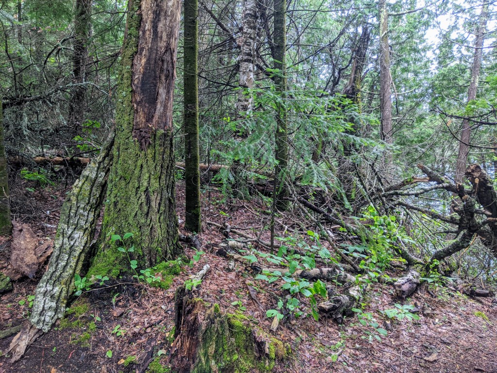 The vibrant green shades of foliage and moss during the summer months on Hunt Lake Trail has been the scene of numerous visualizations while meditating. When I find myself needing to decompress in daily life, I choose to focus on the colour green and I either think, write, or say aloud everything that I can think of that is the colour green. My mind often drifts towards a scene just like the one below.
